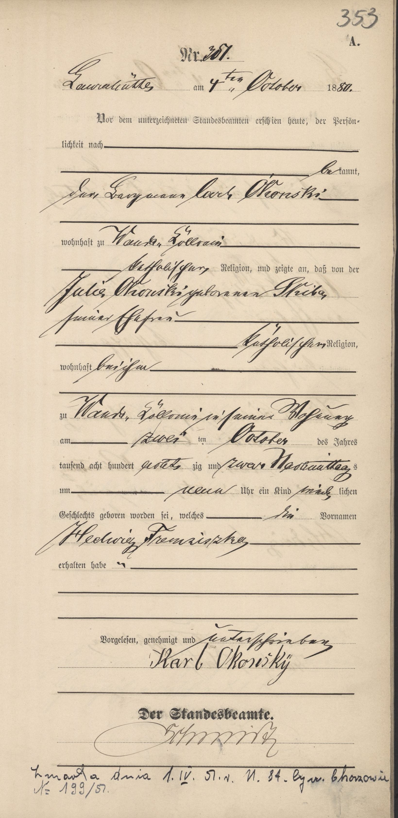 Stefan Okonski *24.12.1848 †10.01.1849 | Francisca Okonski *26.03.1850 †28.09.1851 zmarłe rodzeństwo | Marianna Przełożny z domu Okonski *20.03.1852 †1930 | Karl Okonski ∞ 1879 Ottilie Julianna Skiba †1919 Hedwig Franziska *1880-10-2 †1951-04-1 | Constantin Okonski *18?? ∞ 1886 Florentine Pluszczyk | Johann Okonski *23.05.1862 †25.11.1918 | Vincent Okonski *11.07.1864 | Nicolaus Okonski *1866 †24.05.1870 | Johann Korfanty *1852 †10.01.1868 | |||